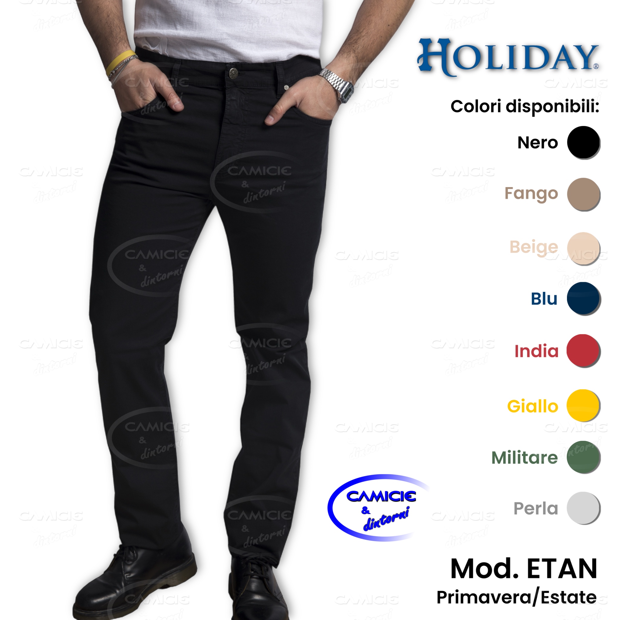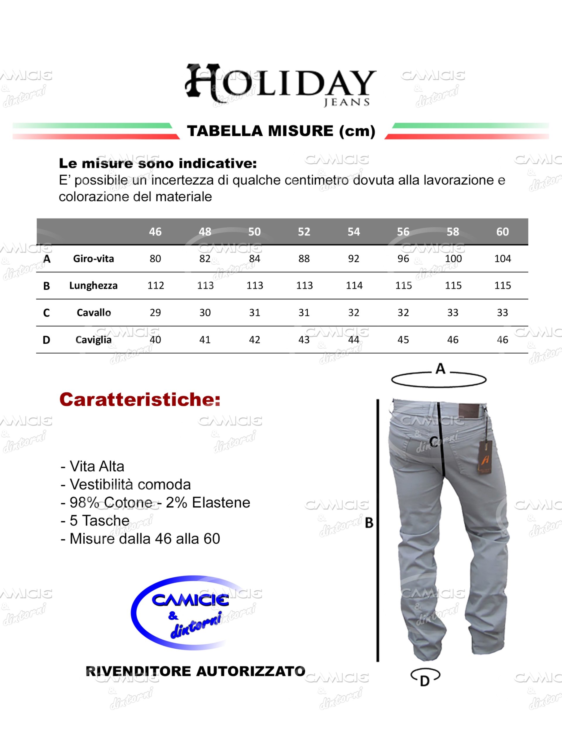 PANTALONE LUNGO HOLIDAY JEANS COMPANY Pantalone comfort STILE CLASSICO 98% Cotone – 2% Elasticizzato MADE IN ITALY Nuova Collezione Taglie disponibili: 46 (32) – 48 (34) – 50 (36) – 52 (38) – 54 (40) – 56 (42) – 58 (44) – 60 (46)