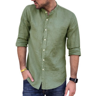 Puro Lino Camicia SLIM Uomo VERDE MILITARE Coreana Manica Lunga TG. S, M, L, XL, XXL e 3XL Primavera/Estate