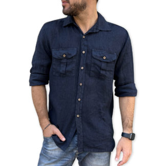Puro Lino Camicia BLU Doppio Taschino TG. M, L, XL, XXL, 3XL Manica Lunga Uomo