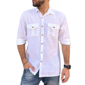 Puro Lino Camicia BIANCA Doppio Taschino TG. M, L, XL, XXL, 3XL Manica Lunga Uomo